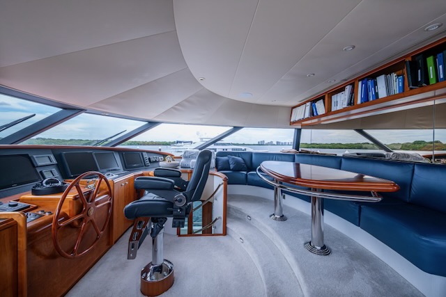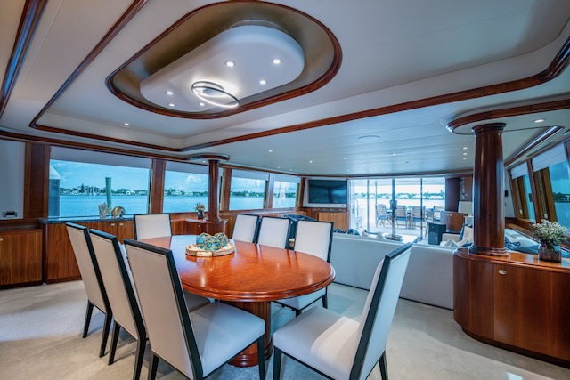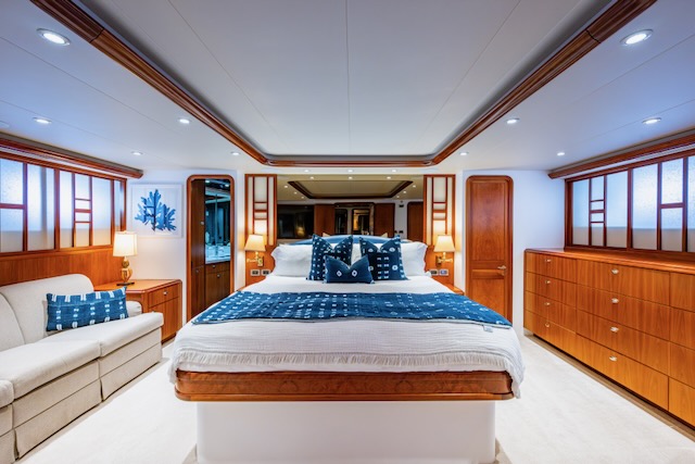 n 2019, renowned interior designer Chanel C. Coontz of Neosage reimagined the yacht’s interior, turning its dated gold-and-yellow aesthetic into a serene, contemporary masterpiece. The transformation introduced a sophisticated indigo color palette across soft finishes, paired with enhanced woodwork, to create a calming and luxurious ambiance. This meticulous redesign was executed with minimal disruption, preserving the yacht’s original charm while elevating its style to meet modern standards.