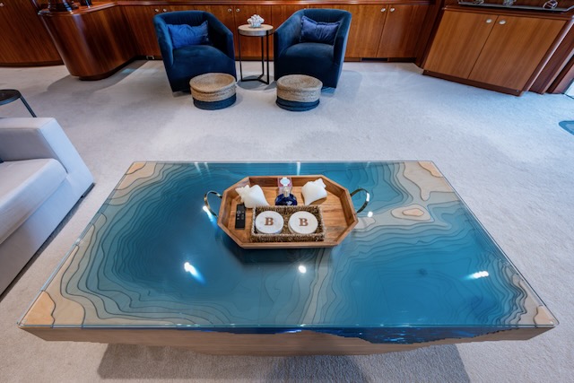 - Upgraded Aft Bar and Dining Sideboard: The aft bar and dining sideboard were enhanced with elegant Azul stone, seamlessly blending with the yacht’s refined craftsmanship for a polished, modern look.