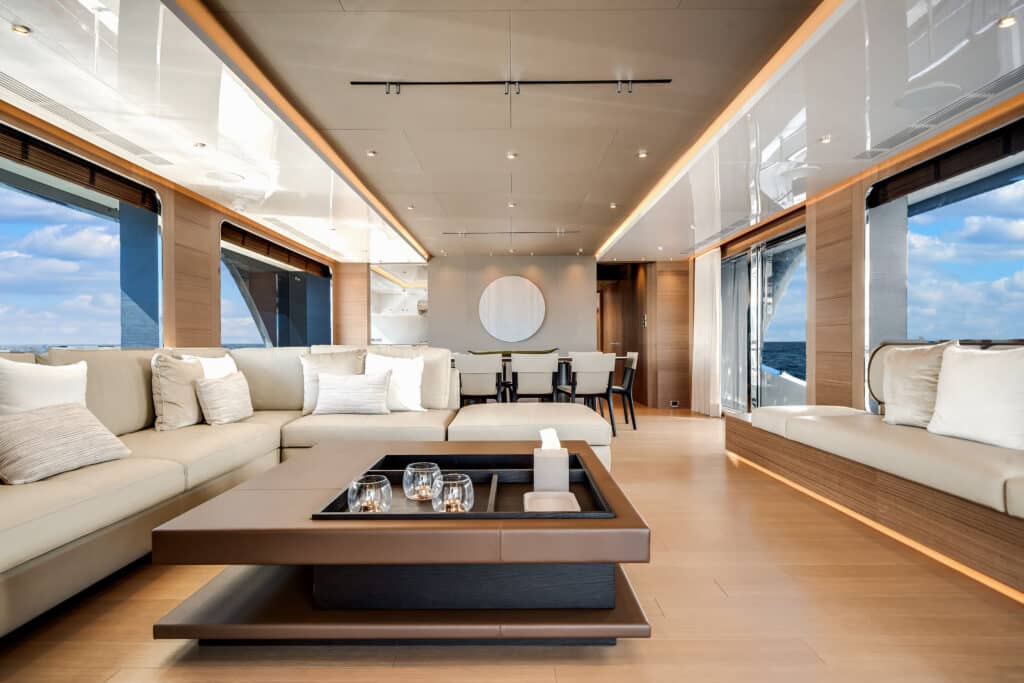 Cassetta offers owners distinct interior palettes (such as Nautique — bold and familiar — and Sereno — tranquil and understated), allowing personalization with high-end finishes, soft textures, abundant natural light, and furniture from brands like Poltrona Frau. The result is a yacht that feels sophisticated and inviting, whether for family cruising or entertaining.