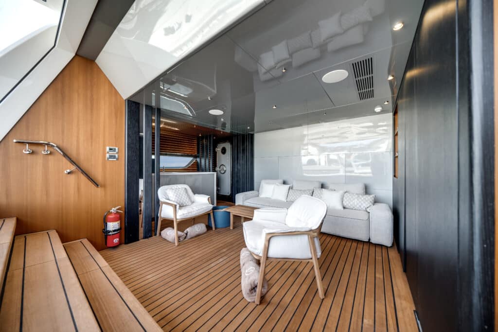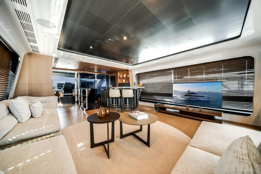 A standout detail is the adjustable opaque glass partition separating it from the wheelhouse, allowing privacy or openness depending on the moment or time of day. The fully walkaround deck adds practicality, making it easy to move between indoor and outdoor areas. With its refined ambiance, natural light, and elevated perspective, the skylounge embodies effortless luxury and social versatility.