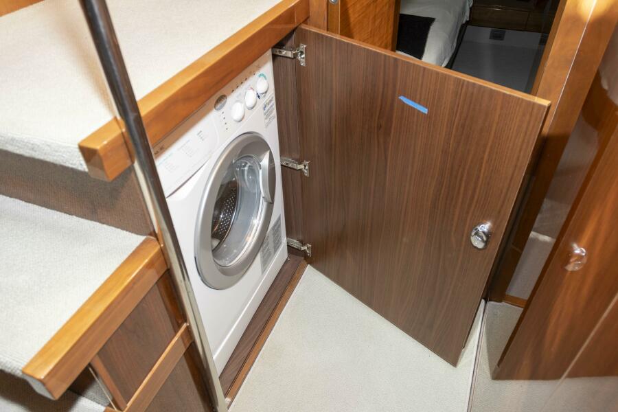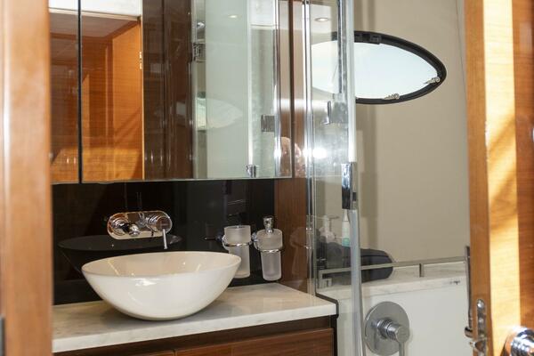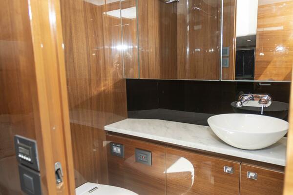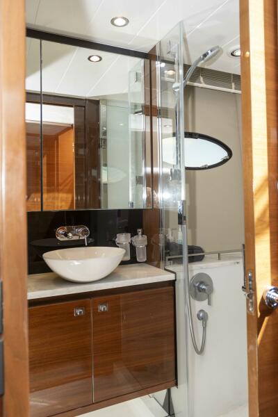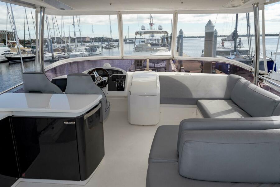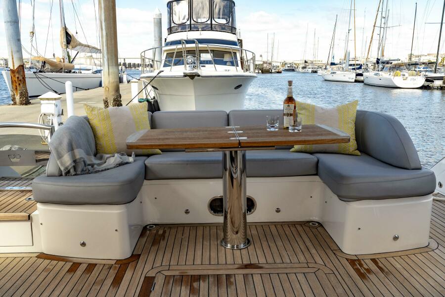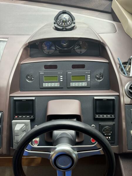 She has a 3-cabin floor plan with a full beam master and ensuite heads. The cockpit has teak decks and varnish teak table and shape seating with access to the crew cabin. There are stairs on either side to access the teak dive platform. The flybridge is very spacious with a hardtop and Strata glass enclosure. The Flybridge also has a full helm, multiple seat areas and wet bar with a grill.