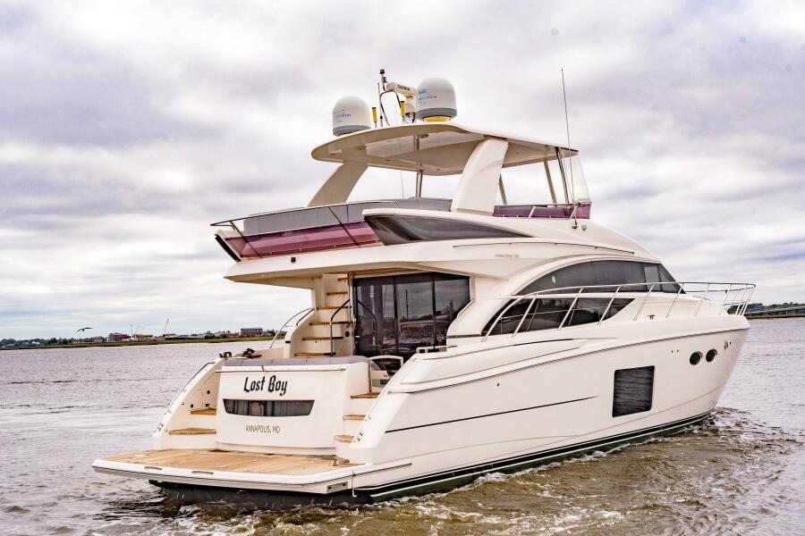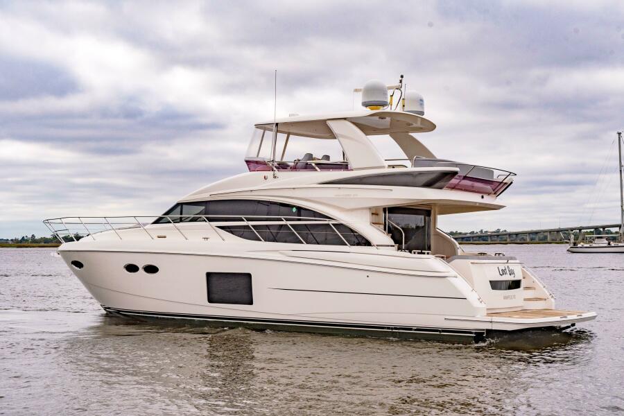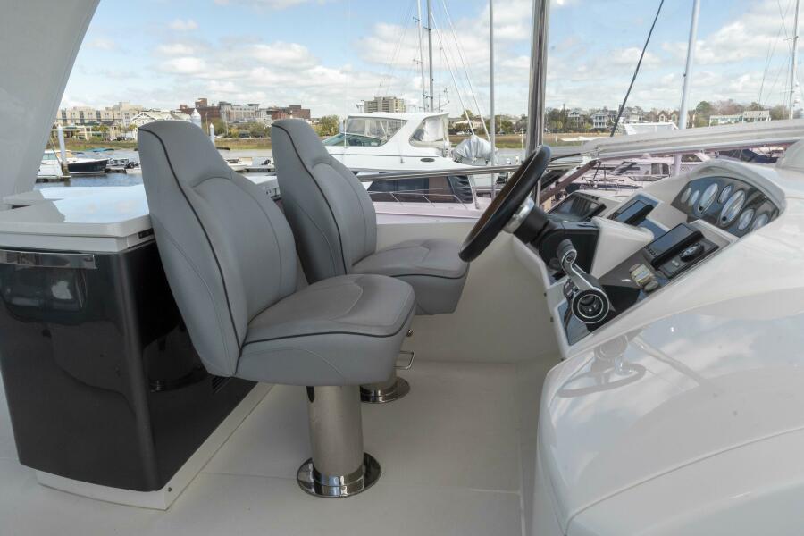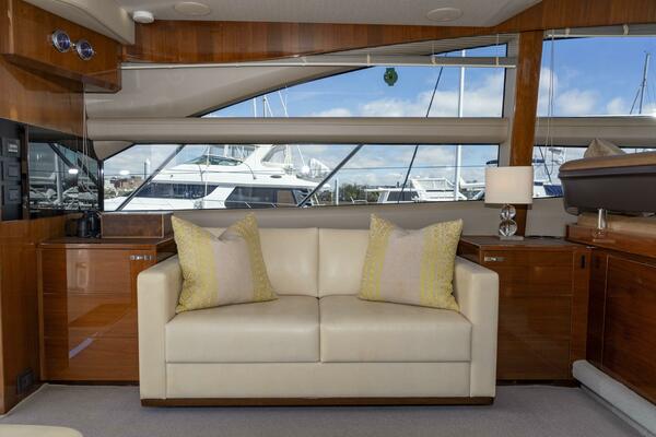 The 56 Princess Flybridge is a very well laid out yacht with a large salon with a galley up, dinette, and a lower helm. There is great visibility and large sliding doors aft.