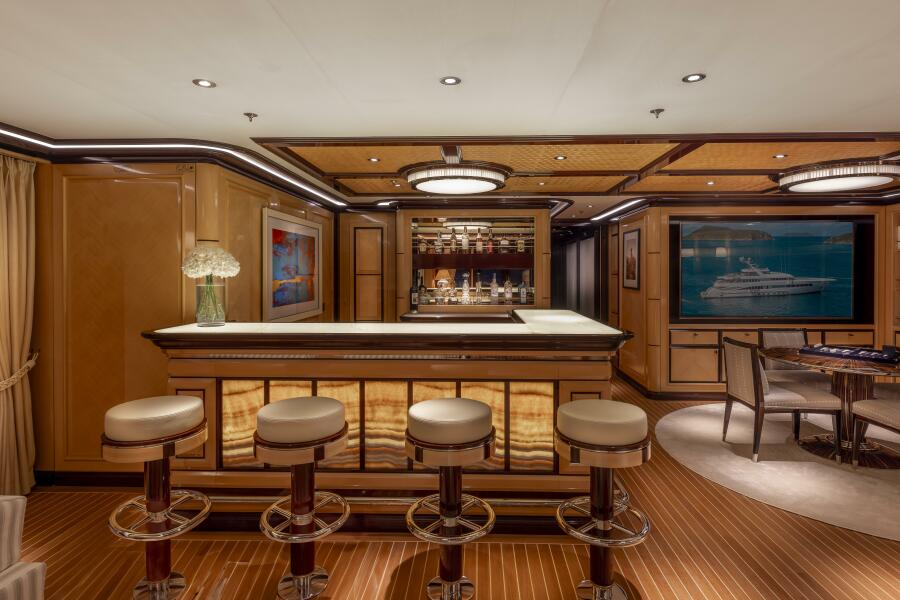 The skylounge provides a relaxed yet sophisticated retreat, finished with solid teak flooring, sycamore inlays, hand-woven teak ceiling panels, and figured sycamore wall finishes. A jewel-like bar area takes center stage, showcasing a backlit alabaster countertop and honey onyx bar fronts, complemented by a Pollaro-designed game table and bespoke saloon furniture.