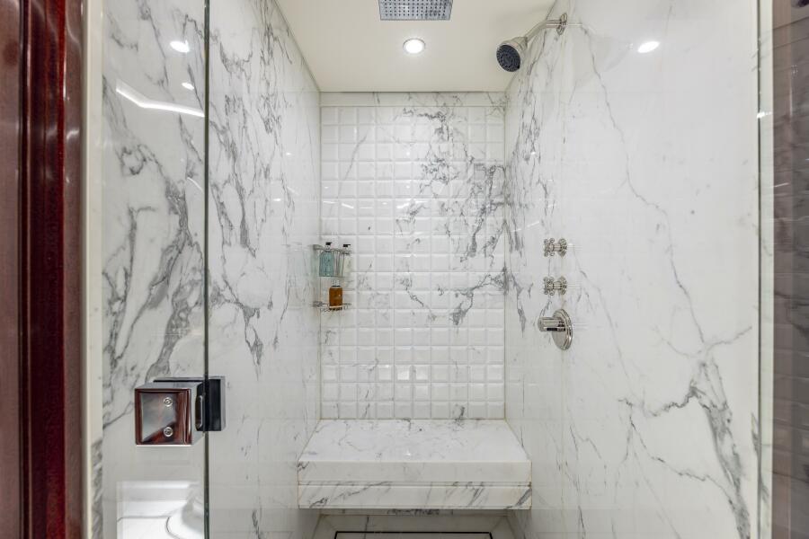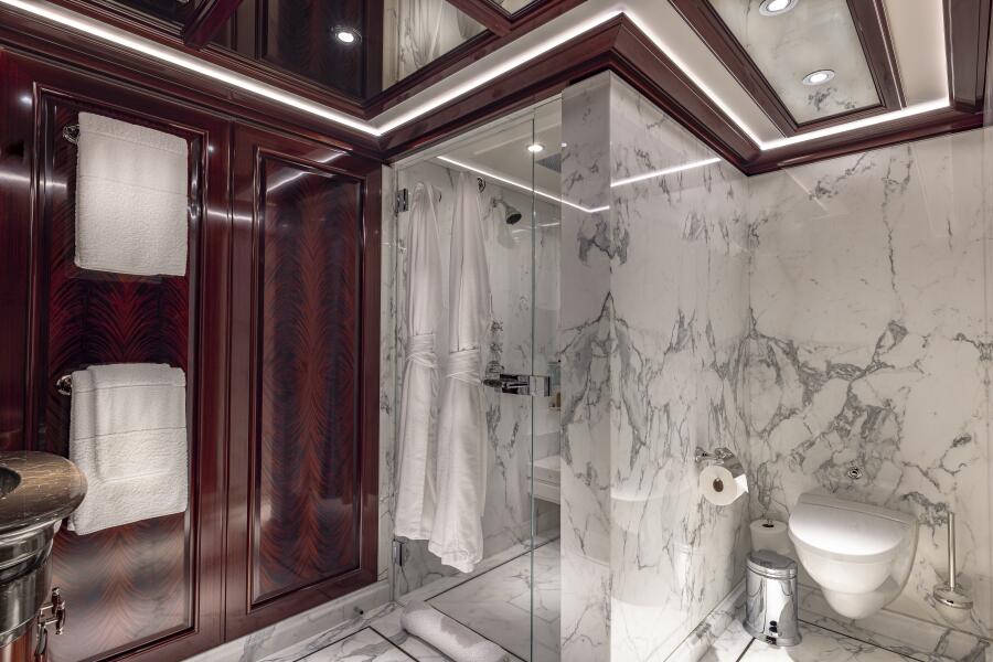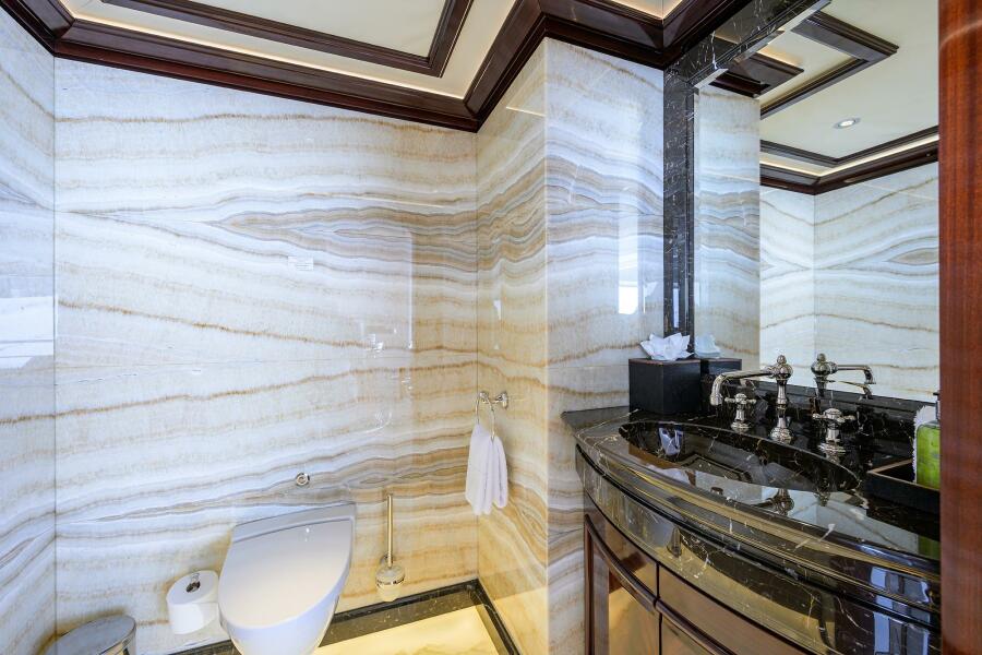 The full-beam Owner’s Suite continues this narrative at the highest level, with sculptural, three-dimensionally curved mahogany panels creating depth, softness, and architectural harmony. The en-suite bathroom is nothing short of extraordinary, centered around a vanity carved from a single solid block of extremely rare Portoro Gold marble (stonecontact.com/portoro-gold-marble/s6401), making it a truly one-of-a-kind statement. This is complemented by Statuario Bianco marble and delicately backlit white onyx, producing a refined interplay of texture, light, and form.