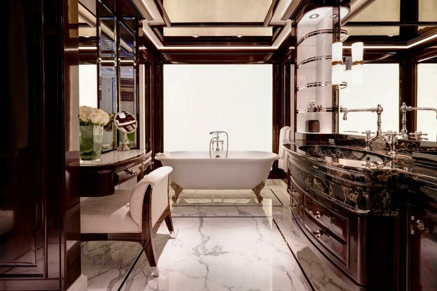 Guest staterooms mirror the Owner’s Suite in quality and finish, each featuring bespoke silk carpets, crotch mahogany wall panels, custom ceiling lights, and Frank Pollaro-designed (//pollaro.com/our-story/) desks and seating. En-suite bathrooms are fitted with Saint Laurent marble vanity tops, each carved from a single block with integrated sinks.